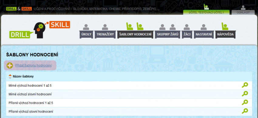 Šablona hodnocení zajišťuje, aby podle dosažených bodů (0 až 100) bylo žákovi přiděleno hodnocení. Může jít o text nebo klasickou známku.
