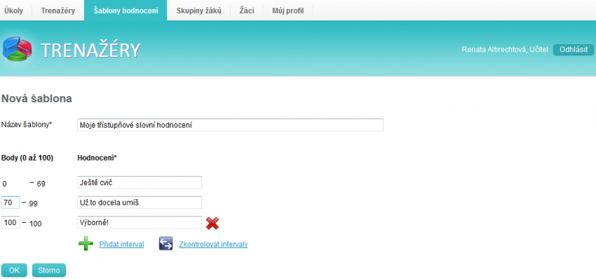 Doporučujeme, abyste nedělali hodnocení příliš mírné. Trenažéry slouží k tomu, aby žáci dokonale zvládli konkrétní jednoduché činnosti. Nemá smysl, aby žáci uměli například násobilku na 50 %. Je potřeba ji umět na 100 %.