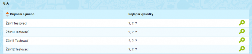 Kliknutím na lupičku u konkrétního žáka zobrazíte všechny dosažené výsledky (tedy ne jenom ty nejlepší).